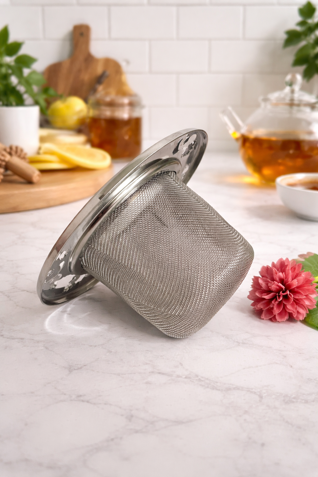 Details: Wire mesh 2” deep basket, 3.5” wide rim circumference. Fits teacup or mug.